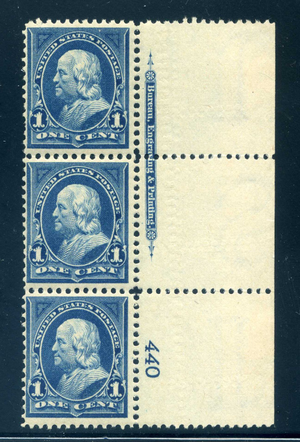 264, 1¢ plate # strip of 3, Inverted wmk, NH, LH on ungummed selvage, Scott $65