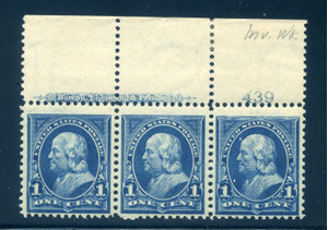 264, 1¢ plate # strip of 3, Inverted wmk,NH, reinforcement on selvage, Scott $65