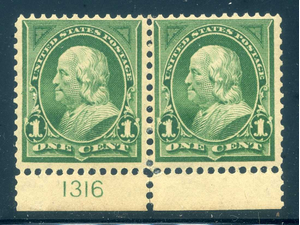 279, 1¢ Franklin plate number pair, Mint NH, light wrinkle at right, Scott $50