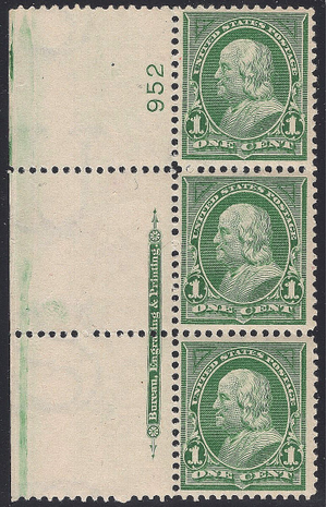 | #279 XF MNH OG-Green 1¢ Washington SIDE PLATE NUMBER AND IMPRINT STRIP OF 3 Scott #279 VF-XF MNH OG 1-cent Franklin SIDE Plate number and Imprint strip of 3 in the new Green color that was required to conform with the UPU standards. Flat plate printing on double line watermark paper issue. Great margins and intense color. No Gum skips or disturbances. A beauty that belongs in your collection.