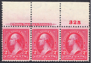 | #279B F-VF MNH OG-2¢ Washington WIDE TOP PLATE NUMBER IMPRINT STRIP OF 3 Scott #279B Type IV F-VF MNH OG-2¢ Washington WIDE TOP NUMBER 325 IMPRINT STRIP OF 3 Flat plate printing on double line watermark paper issue. Great margins and intense color. No Gum skips or disturbances. A beauty that belongs in your collection.