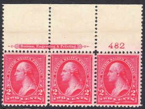 | #279B F-VF MNH OG-2¢ Washington WIDE TOP PLATE NUMBER IMPRINT STRIP OF 3 Scott #279B Type IV F-VF MNH OG-2¢ Washington WIDE TOP NUMBER 482 IMPRINT STRIP OF 3 Flat plate printing on double line watermark paper issue. Great margins and intense color. No Gum skips or disturbances. A beauty that belongs in your collection.