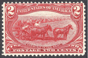 Scott# 286 F-VF MNH OG of the 2 cent Trans-Mississippi commemorative depicting "Farming in the West". Very fresh and fault free.