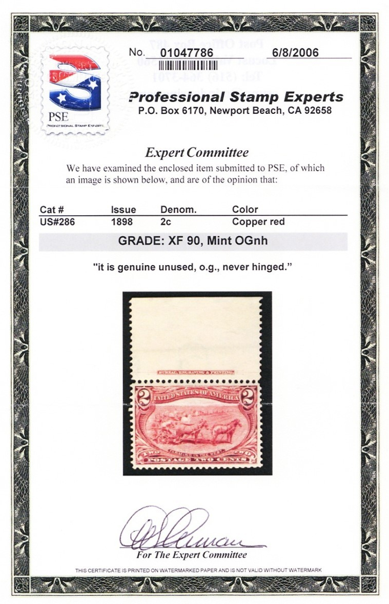 286, Mint XF NH 2¢ Imprint Copy - With Graded 90 PSE Certificate - Stuart Katz