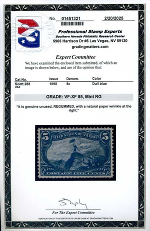 288, 5¢ Trans-Mississippi, PSE Graded VF-XF 85 regum Cert, natural paper wrinkle