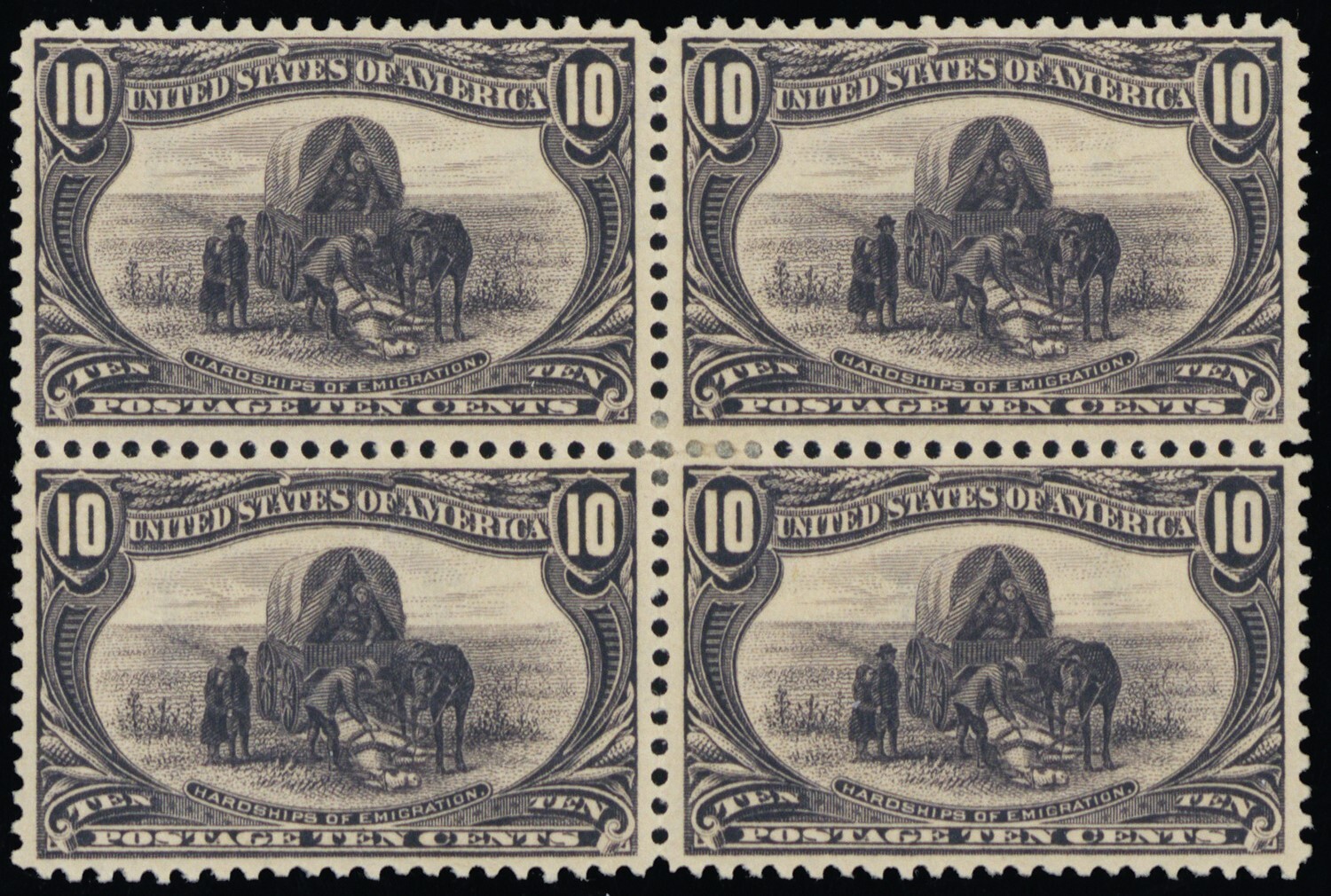 Small remnant in center of all four stamps.