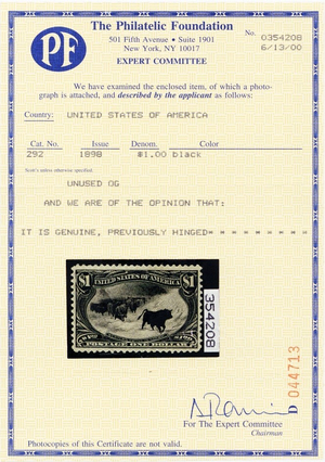 Due to the high cost of obtaining certificates we will only refund the cost of the stamp and not the cost of the certificate for stamps that sell for less than $250 that come back with a negative certificate. Stamps that sell for above $250 will receive a full refund for both the price of the stamp and cost of the certificate if it should come back not as described. For U.S. stamps only certificates from either APS, PSE or from the Philatelic Foundation are accepted, however "graded" certificates or "encased" items are not accepted.