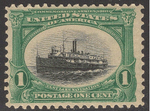 Scott# 294 VF MNH OG 1¢ issue from the Pan-American series depicting "Fast Lake Navigation". This is actually the Steamship "City of Alpena" Steaming from Detroit to Mackinac Island Michigan. Great centering for this always popular early bi-color stamp.