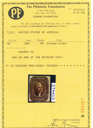 Due to the high cost of obtaining certificates we will only refund the cost of the stamp and not the cost of the certificate for stamps that sell for less than $250 that come back with a negative certificate. Stamps that sell for above $250 will receive a full refund for both the price of the stamp and cost of the certificate if it should come back not as described. For U.S. stamps only certificates from either APS, PSE or from the Philatelic Foundation are accepted, however "graded" certificates or "encased" items are not accepted.