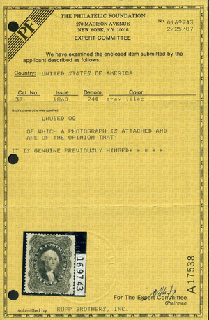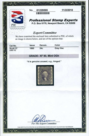 37, 24¢ 1860 Gray Lilac Washington, Mint Hinged PSE Graded XF 90 Cert, SMQ $3250