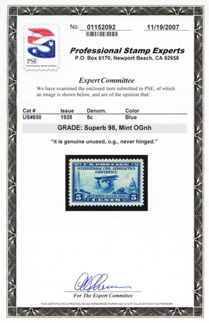 Due to the high cost of obtaining certificates we will only refund the cost of the stamp and not the cost of the certificate for stamps that sell for less than $250 that come back with a negative certificate. Stamps that sell for above $250 will receive a full refund for both the price of the stamp and cost of the certificate if it should come back not as described. For U.S. stamps only certificates from either APS, PSE or from the Philatelic Foundation are accepted, however "graded" certificates or "encased" items are not accepted.