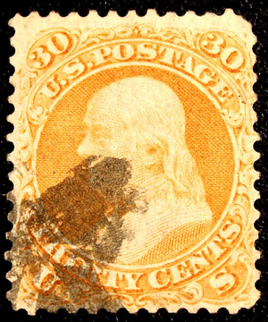 Nice VF Scott #71 30¢ Benjamin Franklin Used with nice neat cancel 1861-66 series. One of the most popular stamps from the 19th century and always in great demand. Very hard to find these this well centered. Scott Cat $180.00.