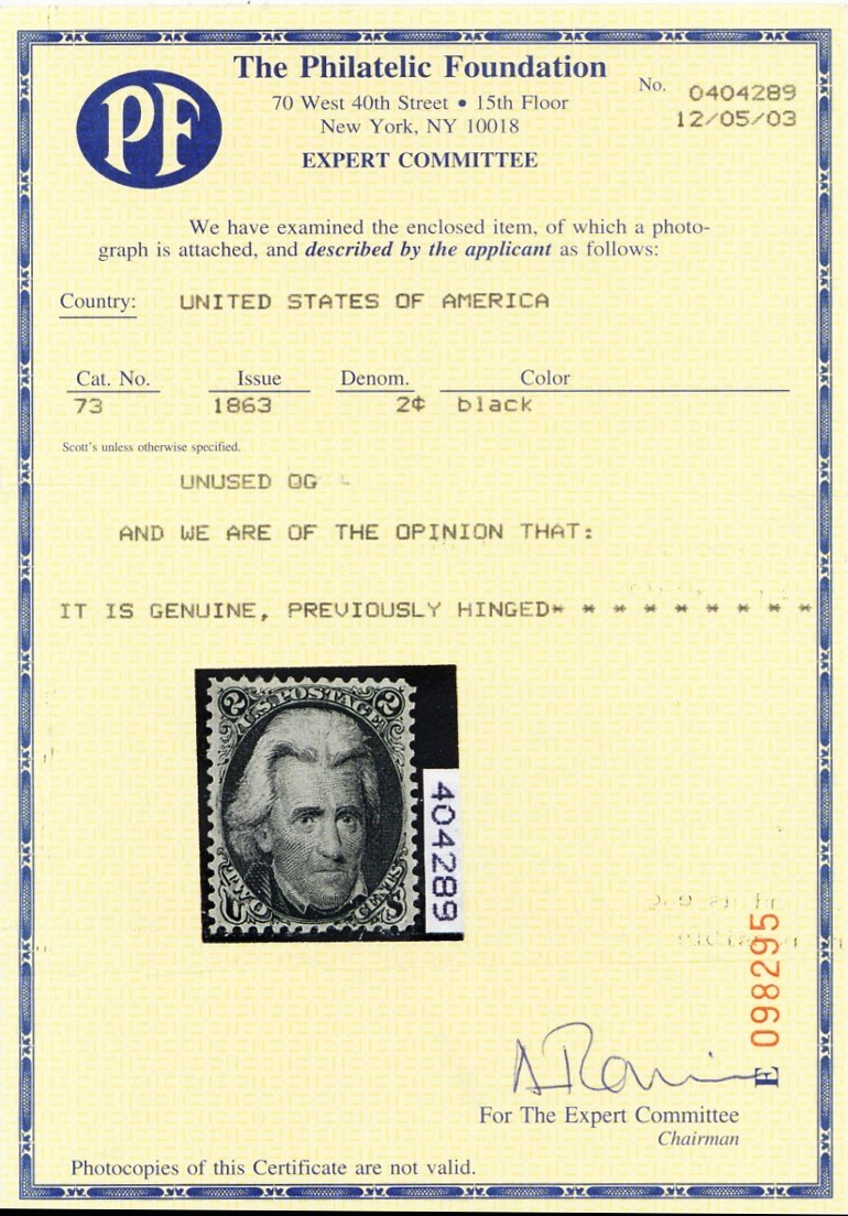 73, Mint VF VLH 2¢ VERY FRESH! With PFC Certificate - Stuart Katz