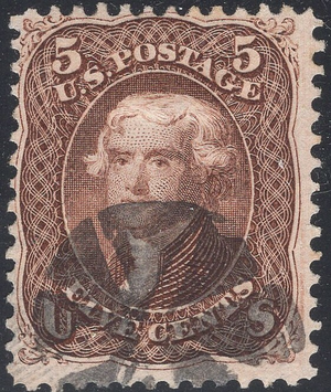 Nice VF Scott #76 5¢ Thomas Jefferson Used with nice fancy cancel 1861-66 series. One of the most popular stamps from the 19th century and always in great demand. Very hard to find these this well centered. Scott Cat $130.00.