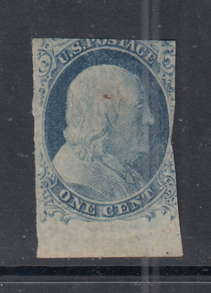 Corner crease is at bottom, mostly in the selvage area and tiny stain is in the middle of Franklin's head. This is quite a dramatic double transfer and in my opinion, it is the most dramatic of the uninverted double transfers of plate 1 late.