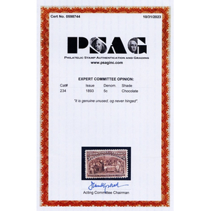 234, Mint VF/XF NH 5¢ Columbian With PSAG Certificate * Stuart Katz