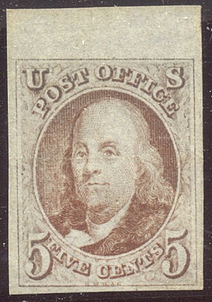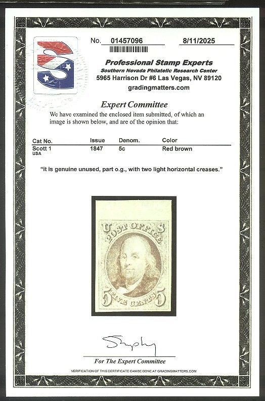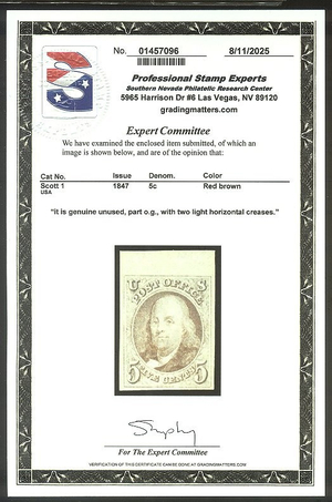 Scott #1: 1847 5c Red Brown Centering & Condition: Mint. XF/SUP and CHOICE appearing with Top Sheet Margin. An incredibly nice looking #1 that is accompanied by a PSE Certificate. There is a light crease running horizontally through the center of the stamp - without that crease, this is a $20,000 stamp. So, my price is quite reasonable considering the appeal of this stamp. Reverse (Gum Side): Part Original gum. Hinged. Faults / Imperfections: There is also another light horizontal crease at the top of the selvage The item pictured is the actual item you are purchasing, unless otherwise noted. I also offer an interest-free layaway plan. Ask me about it!" All items purchased will be mailed a day or two after payment is received. --------------------------------------------------------------------------------