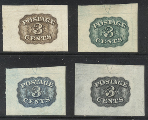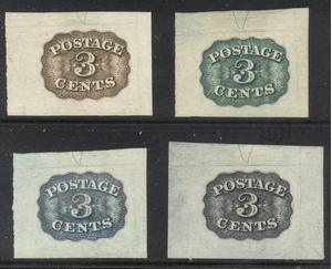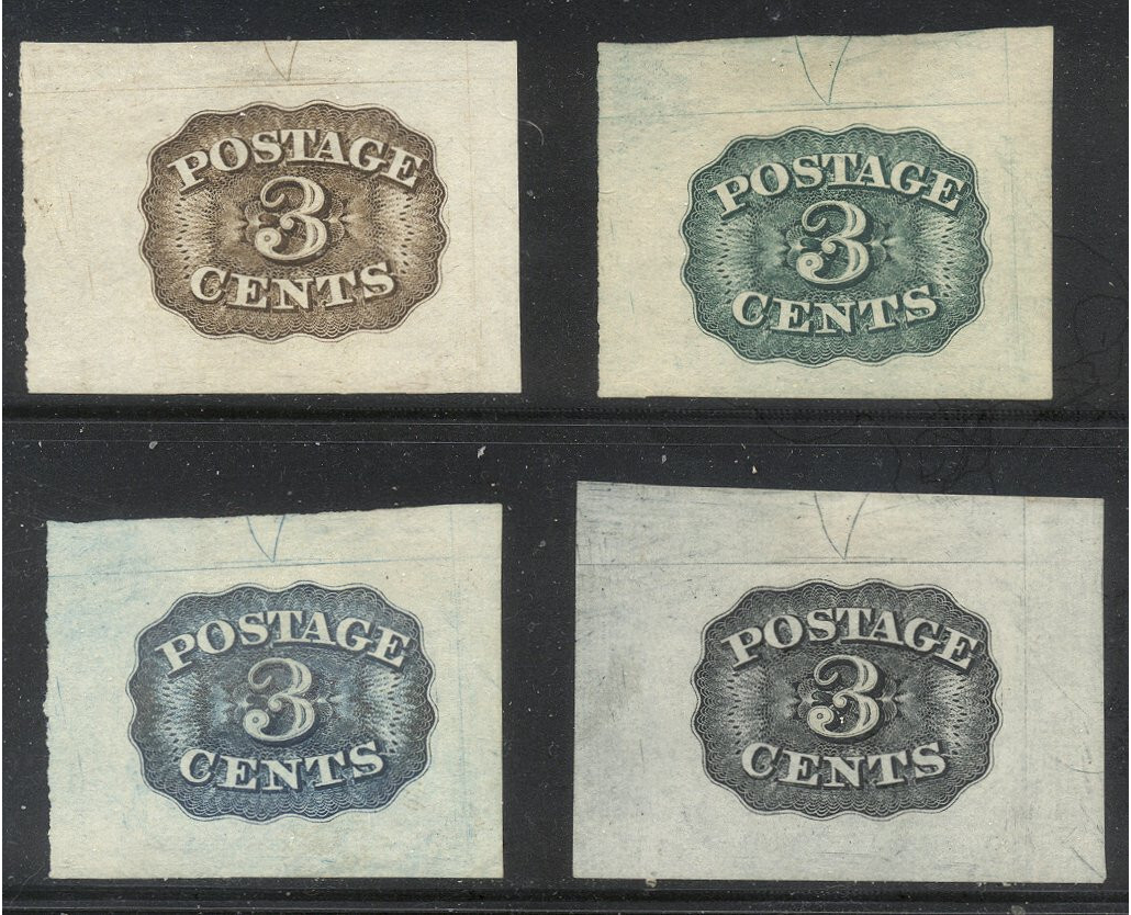 Scott #11-E15b: 3c Numeral Centering & Condition: Very Fine lot of (4) essays in different colors. Reverse (Gum Side): N/A Faults / Imperfections: None The item pictured is the actual item you are purchasing, unless otherwise noted. I also offer an interest-free layaway plan. Ask me about it!" All items will be mailed a day or two after payment is received. --------------------------------------------------------------------------------