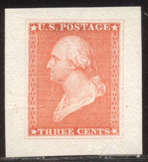 Scott #11-E8a: 3c Washington, Scarlet Centering & Condition: Very Fine and SCARCE Essay. Reverse (Gum Side): N/A Faults / Imperfections: None The item pictured is the actual item you are purchasing, unless otherwise noted. I also offer an interest-free layaway plan. Ask me about it!" All items purchased will be mailed a day or two after payment is received. --------------------------------------------------------------------------------