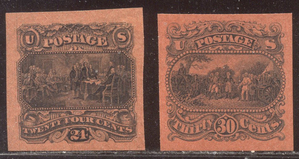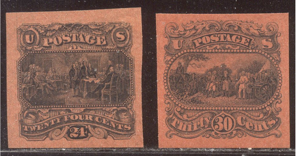 Scott #120-21E Essays: 1869 24c-30c Pictorials Centering & Condition: Very Fine Pair of Essays on Rose colored paper. Reverse (Gum Side): N/A Faults / Imperfections: None The item pictured is the actual item you are purchasing, unless otherwise noted. I also offer an interest-free layaway plan. Ask me about it!" All items will be mailed a day or two after payment is received. --------------------------------------------------------------------------------