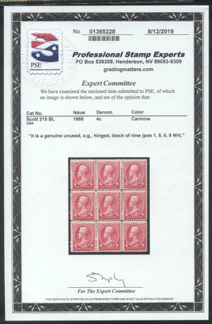 Scott #215: 4c Carmine Centering & Condition: Mint. Fresh. VF/XF and CHOICE. A Copy of the PSE Certificate issued for a block accompanies. This was Pos. 9. Reverse (Gum Side): Original gum. Never Hinged. Faults / Imperfections: None The item pictured is the actual item you are purchasing, unless otherwise noted. I also offer an interest-free layaway plan. Ask me about it!" All items purchased will be mailed a day or two after payment is received. --------------------------------------------------------------------------------