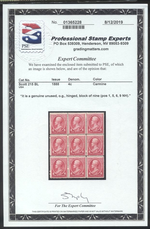 Scott #215: 4c Carmine Centering & Condition: Mint. Fresh. Extremely Fine and CHOICE! A copy of the Foundation certificate issued for its former block accompanies. (This one might even grade at 95) Reverse (Gum Side): Original gum. Very Lightly Hinged. Faults / Imperfections: None The item pictured is the actual item you are purchasing, unless otherwise noted. I also offer an interest-free layaway plan. Ask me about it!" All items purchased will be mailed a day or two after payment is received. --------------------------------------------------------------------------------