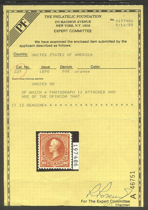 Scott #229: 1890 90c Orange Centering & Condition: Mint. Fresh. Very Fine and CHOICE. A Foundation certificate accompanies. Reverse (Gum Side): Original gum. Never Hinged. (The cert was issued before they started noting "Never Hinged" on their certs. Faults / Imperfections: None The item pictured is the actual item you are purchasing, unless otherwise noted. I also offer an interest-free layaway plan. Ask me about it!" All items purchased will be mailed a day or two after payment is received. --------------------------------------------------------------------------------