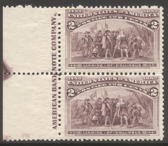 Scott #231 var: 1893 2c Columbian w/ Broken Hat Centering & Condition: Mint. Fresh. Fine-Very Fine Pair with Imprint. Reverse (Gum Side): Original gum. Never Hinged. Faults / Imperfections: None The item pictured is the actual item you are purchasing, unless otherwise noted. I also offer an interest-free layaway plan. Ask me about it!" All items will be mailed a day or two after payment is received. --------------------------------------------------------------------------------
