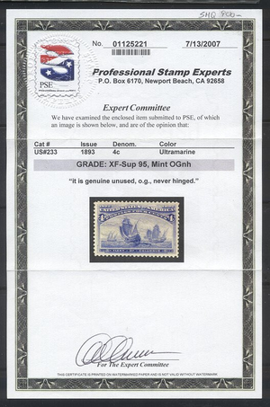 Scott #233: 1893 4c Columbian Centering & Condition: Mint. Fresh. XF/SUP GEM. A Graded PSE Certificate accompanies. Reverse (Gum Side): Original gum. Never Hinged. Faults / Imperfections: None The item pictured is the actual item you are purchasing, unless otherwise noted. I also offer an interest-free layaway plan. Ask me about it!" All items will be mailed a day or two after payment is received. --------------------------------------------------------------------------------