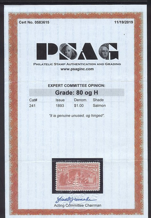Scott #241: 1893 $1.00 Columbian Centering & Condition: Mint. Fresh. Rich color. Very Fine. Reverse (Gum Side): Original gum. Lightly Hinged. Faults / Imperfections: None The item pictured is the actual item you are purchasing, unless otherwise noted. I also offer an interest-free layaway plan. Ask me about it!" All items will be mailed a day or two after payment is received. --------------------------------------------------------------------------------