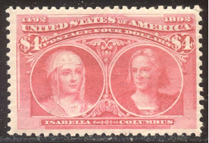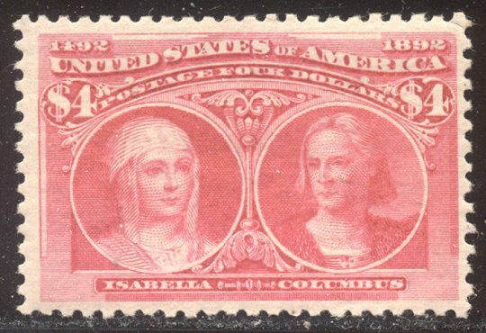 Scott #244: 1893 $4.00 Columbian Centering & Condition: Mint. Post Office Fresh. Rich color. Fine-Very Fine. Reverse (Gum Side): Original gum. Lightly Hinged. Faults / Imperfections: Trivial corner perf crease (there is no spot under Columbus's eye) The item pictured is the actual item you are purchasing, unless otherwise noted. I also offer an interest-free layaway plan. Ask me about it!" All items will be mailed a day or two after payment is received. ![]() ![]() ![]() --------------------------------------------------------------------------------