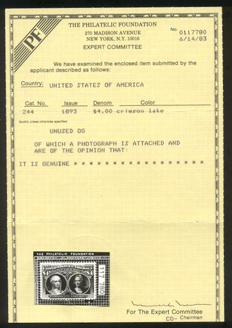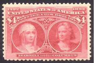 Scott #244: 1893 $4.00 Columbian Centering & Condition: Mint. Fresh. Gorgeous color. Fine-Very Fine and VERY SCARCE as NH. Reverse (Gum Side): Original gum. Never Hinged. Faults / Imperfections: None The item pictured is the actual item you are purchasing, unless otherwise noted. I also offer an interest-free layaway plan. Ask me about it!" All items will be mailed a day or two after payment is received. --------------------------------------------------------------------------------