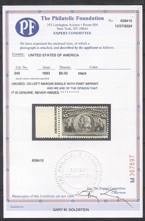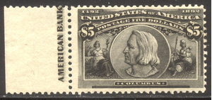Scott #245: 1893 $5.00 Columbian Centering & Condition: Mint. Post Office Fresh with Rich color. Looks like it Reverse (Gum Side): Original gum. Never Hinged. Faults / Imperfections: None The item pictured is the actual item you are purchasing, unless otherwise noted. I also offer an interest-free layaway plan. Ask me about it!" All items will be mailed a day or two after payment is received. ![]() ![]() ![]() --------------------------------------------------------------------------------