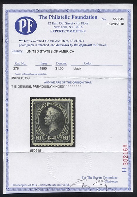 U.S. #276 Mint VF BEAUTY w/ Cert - 1895 $1.00 Black, Type I