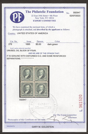 Scott #278: 364150543770 Centering & Condition: Mint. Fresh. Rich color. Fine-Very Fine example of this SCARCE stamp. A copy of the Foundation certificate for the block from which this stamp was taken accompanies. Reverse (Gum Side): Slightly disturbed original gum. Lightly Hinged. Faults / Imperfections: None The item pictured is the actual item you are purchasing, unless otherwise noted. I also offer an interest-free layaway plan. Ask me about it!" All items purchased will be mailed a day or two after payment is received. --------------------------------------------------------------------------------