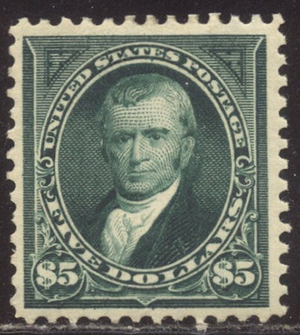 Scott #278: 1895 $5 Marshall Centering & Condition: Mint. Fresh. Rich color. Very Fine and CHOICE. A Foundation certificate for its block accompanies. Reverse (Gum Side): Original gum. Very Lightly Hinged. Faults / Imperfections: None The item pictured is the actual item you are purchasing, unless otherwise noted. I also offer an interest-free layaway plan. Ask me about it!" All items purchased will be mailed a day or two after payment is received. --------------------------------------------------------------------------------