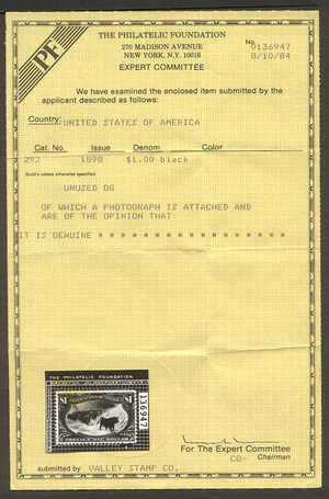 Scott #292: 1898 $1.00 Trans-Mississippi Centering & Condition: Mint. Fresh. Fine-Very Fine. A Foundation certificate accompanies. Reverse (Gum Side): Original gum. Lightly Hinged. Faults / Imperfections: None The item pictured is the actual item you are purchasing, unless otherwise noted. I also offer an interest-free layaway plan. Ask me about it!" All items will be mailed a day or two after payment is received. --------------------------------------------------------------------------------