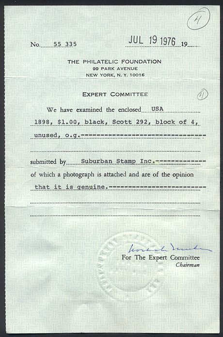 Scott #292: 1898 $1.00 Trans-Mississippi Centering & Condition: Mint. Fresh. Rich color. Fine-Very Fine. A Foundation certificate accompanies showing a block (this is the lower right stamp). Reverse (Gum Side): Original gum. Never Hinged. There are a couple of pinhead-sized gum disturbances (not hinge marks) Faults / Imperfections: None The item pictured is the actual item you are purchasing, unless otherwise noted. I also offer an interest-free layaway plan. Ask me about it!" All items purchased will be mailed a day or two after payment is received. -------------------------------------------------------------------------------- Please click any of the following to read: |
