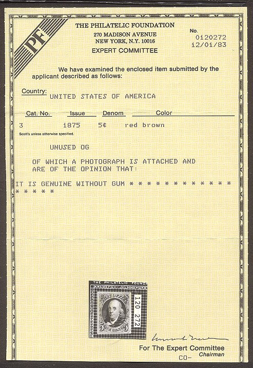 Scott #3: 1875 3c Red Brown Centering & Condition: Unused. Rich color. Very nice margins all around. XF/SUP and CHOICE! A Foundation certificate accompanies. Reverse (Gum Side): Without gum as issued Faults / Imperfections: None The item pictured is the actual item you are purchasing, unless otherwise noted. I also offer an interest-free layaway plan. Ask me about it!" All items purchased will be mailed a day or two after payment is received. --------------------------------------------------------------------------------