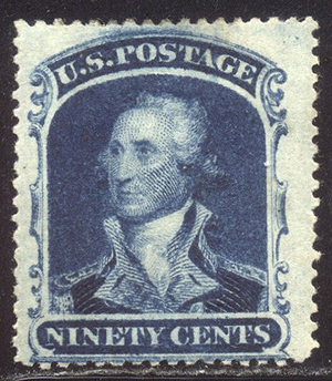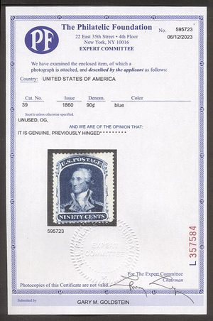 Scott #39: 90c Blue Centering & Condition: Mint. Fresh. Rich color. Well-centered and SCARCE. A Foundation certificate accompanies. Reverse (Gum Side): Original gum. Hinged. Faults / Imperfections: None The item pictured is the actual item you are purchasing, unless otherwise noted. I also offer an interest-free layaway plan. Ask me about it!" All items purchased will be mailed a day or two after payment is received. --------------------------------------------------------------------------------