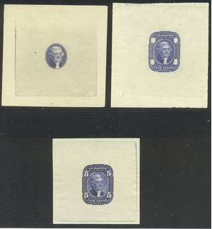 Scott #67 E1b, 2a and 3a: 5c Jefferson Progressive Set, Blue Centering & Condition: Very Fine set of essays. Reverse (Gum Side): N/A Faults / Imperfections: None The item pictured is the actual item you are purchasing, unless otherwise noted. I also offer an interest-free layaway plan. Ask me about it!" All items will be mailed a day or two after payment is received. --------------------------------------------------------------------------------