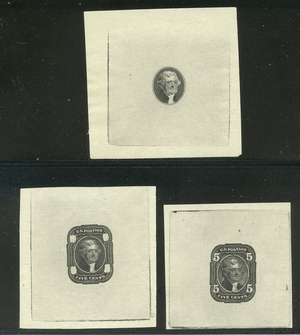 Scott #67-E1-3a: 5c Jefferson, Progressive, Black Centering & Condition: Very Fine set of Progressive Essays. Reverse (Gum Side): N/A Faults / Imperfections: None The item pictured is the actual item you are purchasing, unless otherwise noted. I also offer an interest-free layaway plan. Ask me about it!" All items will be mailed a day or two after payment is received. --------------------------------------------------------------------------------