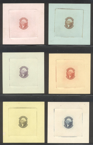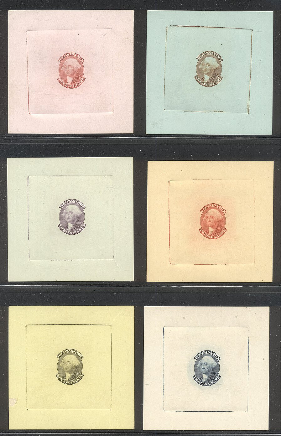 Scott #69-E2e: 12c Washington, Set On Colored Cards Centering & Condition: Very Fine Complete Set of the (6) essays in different colors. Reverse (Gum Side): Some with remnant Faults / Imperfections: None The item pictured is the actual item you are purchasing, unless otherwise noted. I also offer an interest-free layaway plan. Ask me about it!" All items will be mailed a day or two after payment is received. --------------------------------------------------------------------------------