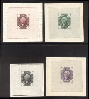 Scott #69-E3a: 12c Washington Centering & Condition: Fresh group of (4) Essays in Reverse (Gum Side): N/A Faults / Imperfections: None The item pictured is the actual item you are purchasing, unless otherwise noted. I also offer an interest-free layaway plan. Ask me about it!" All items will be mailed a day or two after payment is received. --------------------------------------------------------------------------------