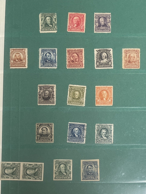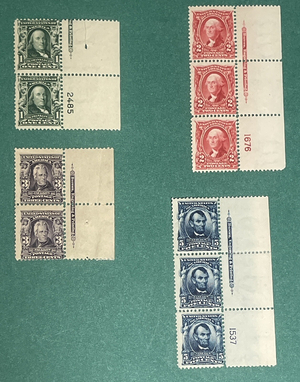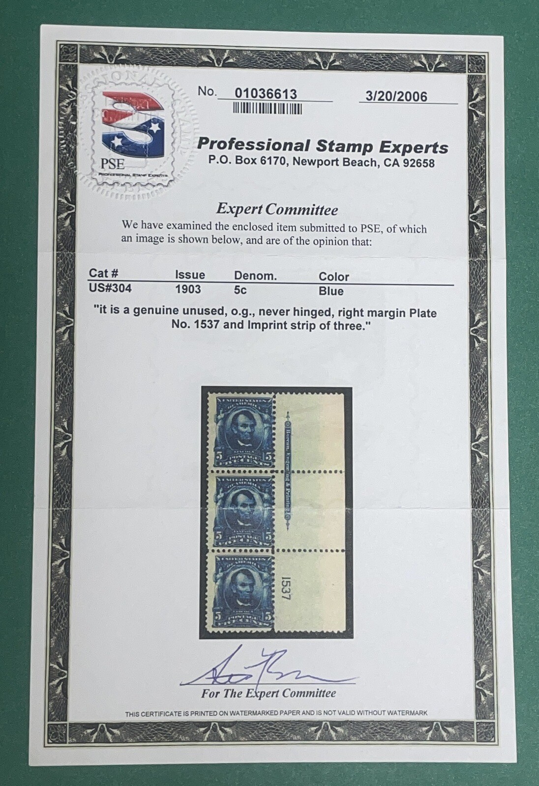 Scott 300-315. Singles 300-311 are mnh; 312 used; 313 used and looks regummed; 314 single mnh, pair mnh; 315 mnh grade 90 w/cert; 300 pair is mnh with pinhole in selvage; 301 strip of 3 is mnh, but perf separation from selvage in middle stamp and bottom; pair of 302 is mint og with hinge on selvage only; 304 strip of 3 is mnh with cert.