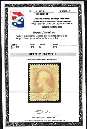WCstamps: U.S. Scott #186 / VF, Unused, 2025 PSE Cert Grade 80J / SMQ $275+