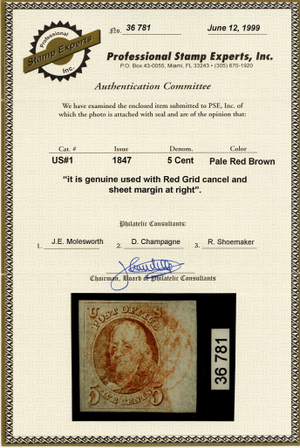 Due to the high cost of obtaining certificates we will only refund the cost of the stamp and not the cost of the certificate for stamps that sell for less than $250 that come back with a negative certificate. Stamps that sell for above $250 will receive a full refund for both the price of the stamp and cost of the certificate if it should come back not as described. For U.S. stamps only certificates from either APS, PSE or from the Philatelic Foundation are accepted, however "graded" certificates or "encased" items are not accepted.