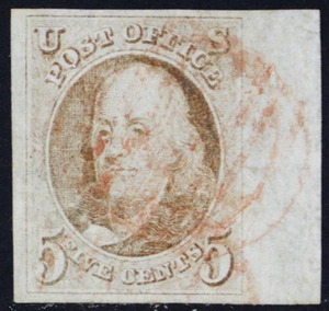 1, Used 5¢ Sheet Margin - Superb - Pale Red Brown Shade PSE Cert - Stuart Katz