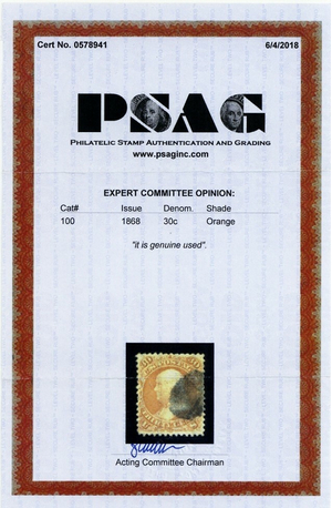 100, Used 30¢ F/VF RARE Sound Stamp PSAG Certificate Cat $950.00 - Stuart Katz