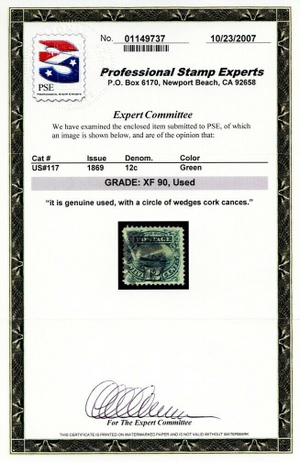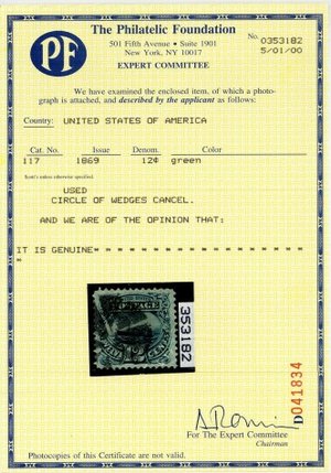 Due to the high cost of obtaining certificates we will only refund the cost of the stamp and not the cost of the certificate for stamps that sell for less than $250 that come back with a negative certificate. Stamps that sell for above $250 will receive a full refund for both the price of the stamp and cost of the certificate if it should come back not as described. For U.S. stamps only certificates from either APS, PSE or from the Philatelic Foundation are accepted, however "graded" certificates or "encased" items are not accepted.